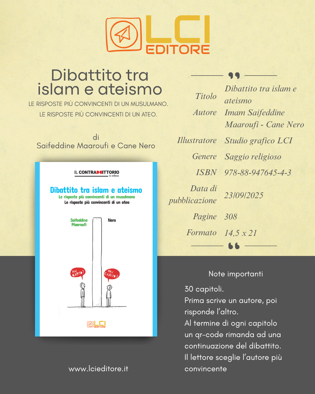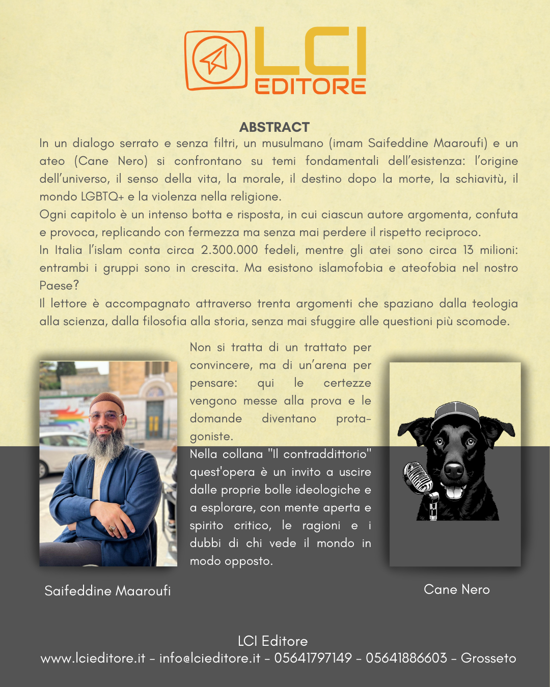 Oggi l'Islam è la seconda religione per numero di fedeli in Italia, con circa 2.300.000 praticanti, dopo il cattolicesimo, che ne conta oltre 35 milioni. Ma tra questi due grandi mondi religiosi, si fa strada un gruppo sempre più numeroso: circa 13 milioni di italiani che non aderiscono ad alcuna fede, di cui oltre 8 milioni si dichiarano apertamente atei. In questo nuovo volume della collana Il Contraddittorio, si confrontano con rispetto e rigore intellettuale un musulmano, l’Imam Saifeddine Maaroufi, e un ateo, Cane Nero. I due autori discutono 30 temi fondamentali in un dibattito serrato, prima attraverso il testo scritto e poi in video, facilmente accessibili tramite i QR code presenti nel libro. Un’opera da leggere con curiosità, per ampliare i propri orizzonti, mettere alla prova le proprie convinzioni o semplicemente conoscere più a fondo il pensiero dell’altro. Acquistabile in prevendita dal 04/08/2025 (con autografo e dedica dell'autore) In vendita ufficialmente (Amazon e libreria) dal 23/09/2025